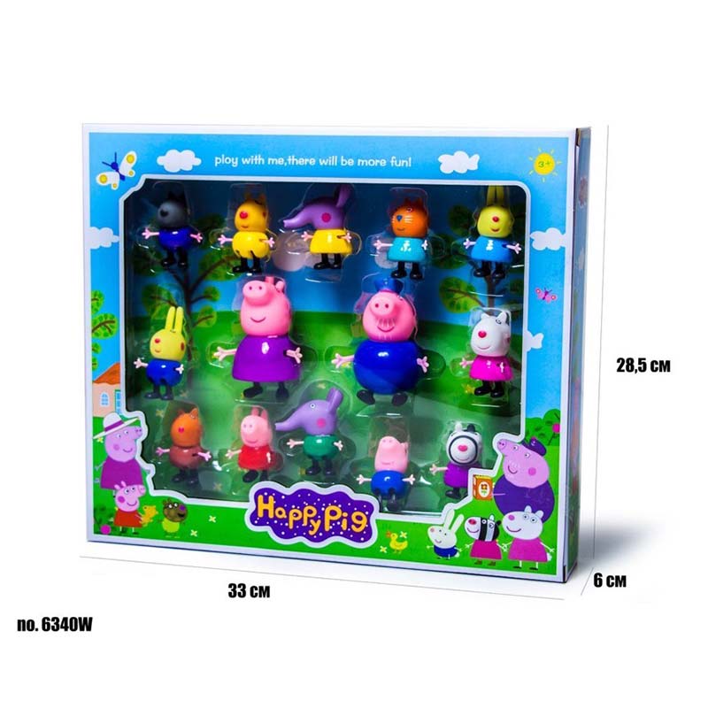 Ігровий набір Свинка Пеппа та її друзі - чудовий подарунок для шанувальників популярного мультфільму про свинку Пеппу. Цей набір буде цікавий для Ваших малюків і його подружок. У наборі 14 фігурок з рухомими ручками і ніжками. Якісні фігурки тішитимуть дитину своєю схожістю з героями мультфільму і дозволять втілювати різні сюжети в реальність. Тулуще фігурки виготовлено з якісного пластику, а голова з м'якої гуми. Розмір упаковки: 31 х 28,5 х 6 см. Висота фігурки: 10 см і 6 см.
