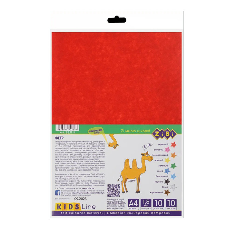 Набір кольорового фетрового матеріалу від ZiBi — це яскравий і приємний на дотик інструмент для втілення будь-яких творчих фантазій Вашої дитини, а також для тренування почуття кольору і пропорцій, розвитку моторики.