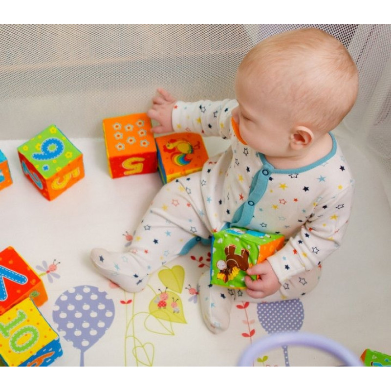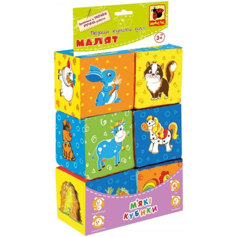 Запрошуємо на ферму! Мякі кубики із зображеннями добрих звіряток звуть малюка пограти. У наборі шість різнокольорових кубиків. Іграшка легка і мяка на дотик. Дитина може сміливо гризти, кидати, мяти кубики, що так подобається робити дітям в цьому віці. Маніпуляції зі шкірою або мякою відмінно тренують координацію рухів. Яскраві барвисті малюнки розвивають окомір, сприйняття кольорів. Іграшка виготовлена з якісних безпечних для самих маленьких діток матеріалів. Перші кубики допоможуть закласти умови для гармонійного розвитку вашої дитини, а попереду ще безліч маленьких і великих відкриттів. Світ малюка складається з безлічі речей. Те, чим оточений дитина, формує його почуття, мислення, сприйняття. Оточіть ваше чадо теплотою і турботою, а також корисними розвиваючими іграшками. У наборі 6 кубиків. Розмір одного кубика: 8 × 8 × 8 см. Склад: х /б тканину; швейна фурнітура; поролон. Розмір: 16,5 × 24 × 8 см. Розмір в упаковці: 16,5 × 33 × 8 см.