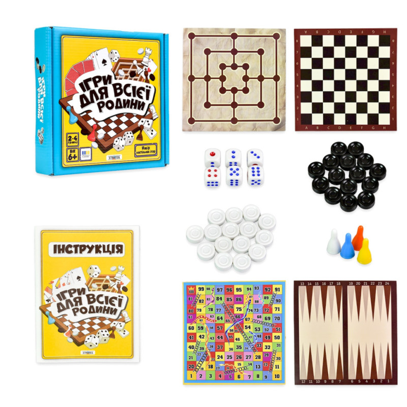 Комплектація: коробка, гральні поля, кубики, шашки, гральні фішки, інструкція.