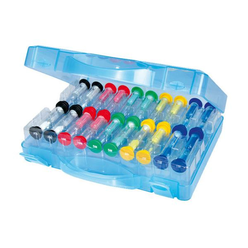 У навчальний набір Edu-Toys входить 4 однакових комплекти пісочних годинників. У кожному комплекті 5 видів годинників з різним часом відліку. Вони відрізняються за кольором піску та основи. Загалом у наборі 20 одиниць.Червоний годинник 10 хвилин;зелений #8211;5 хвилин;жовтий #8211;3 хвилини;синій #8211;1 хвилина;чорний #8211;30 секунд..| Аксесуари для зберігання | валізка |