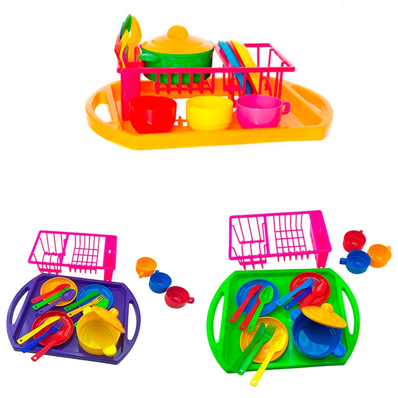 Посуд "Юна господарочка" №3 складається з 19 елементів. У комплект входить: 1 рознос, 3 тарілки, 3 чашки, 3 ложки, 3 виделки, 3 ножі, 1 каструля, 1 кришка, 1 сушка. Розмір: 37х26х2 см. Виробник може змінювати колірну гамму товару без попередження. Наявність кольорів уточнюйте у менеджера компанії.