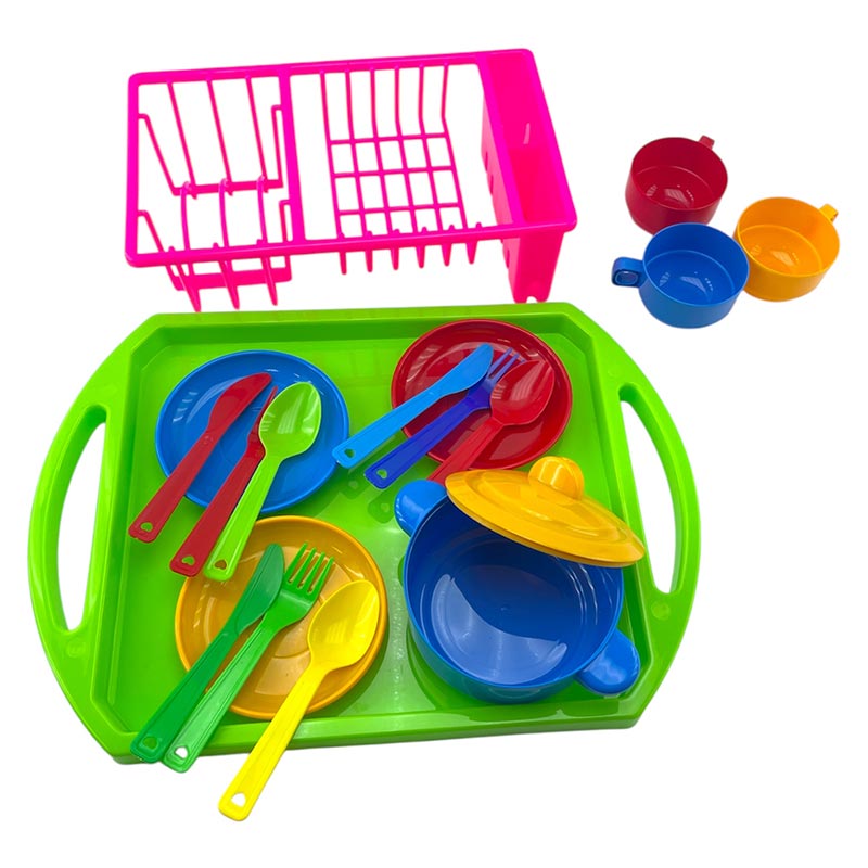 Посуд "Юна господарочка" №3 складається з 19 елементів. У комплект входить: 1 рознос, 3 тарілки, 3 чашки, 3 ложки, 3 виделки, 3 ножі, 1 каструля, 1 кришка, 1 сушка. Розмір: 37х26х2 см. Виробник може змінювати колірну гамму товару без попередження. Наявність кольорів уточнюйте у менеджера компанії.