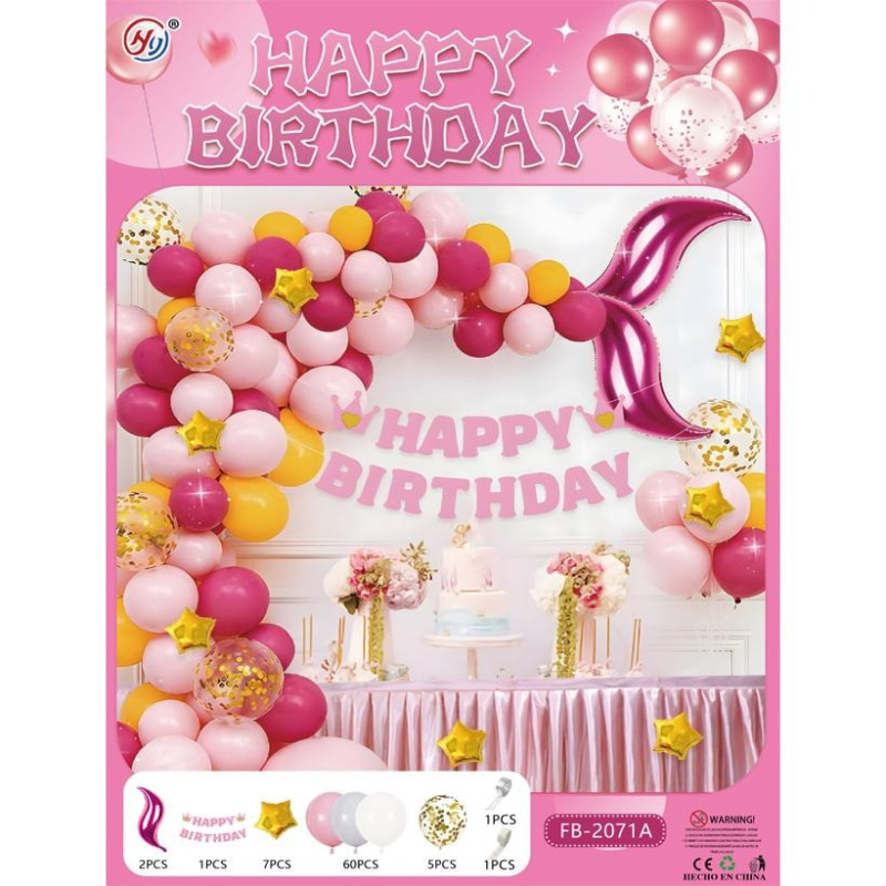 Набір повітряних кульок містить все необхідне для створення святкової атмосфери та оформлення приміщення. У набір входять кулі рожевого, сірого, білого кольорів 60шт, зірка 7шт, напис 1шт, кульки "елементи хвоста" 2шт, кулька з наповненням "блискітки" 5шт; стрічка для кріплення куль; клейові точки 1 рулон