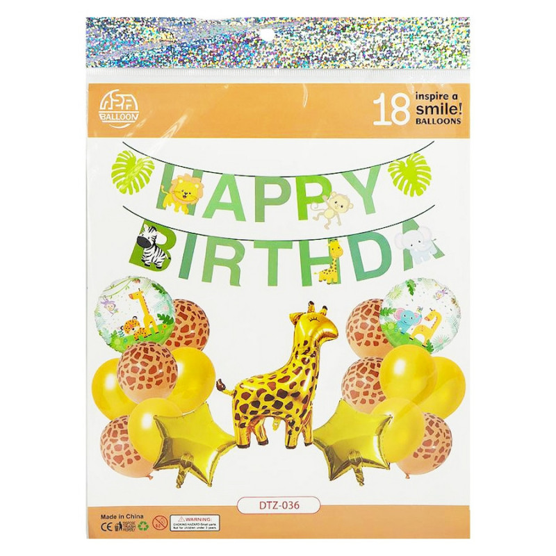 Набір повітряних куль у стилі «Сафарі» - ідеальне рішення для створення яскравої та атмосферної фотозони на дитячому святі. Тематичний дизайн із тваринними принтами та фігуркою жирафа допоможе легко перетворити будь-яке приміщення на справжню пригоду в дикій природі.