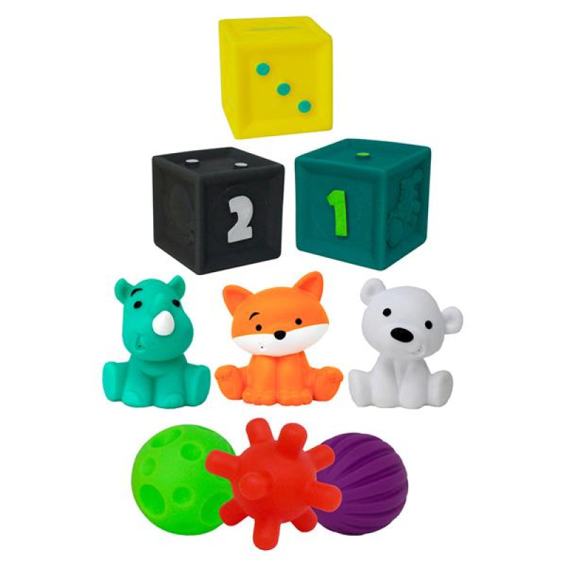 Набір розвивальних іграшок у тубусі Infantino складається з 9 предметів: 3 кольорових текстурних кульок, 3 фігурок звірят, 3 кубиків із цифрами. Усі іграшки виконані із м'якого приємного на дотик матеріалу, який можна жувати.Іграшки познайомлять малюків із кольорами, текстурами і числами. Дітям сподобається досліджувати і жувати гумові барвисті іграшки. Набір розвивальних іграшок у тубусі Infantino призначений для хлопчиків і дівчаток від 6 місяців.