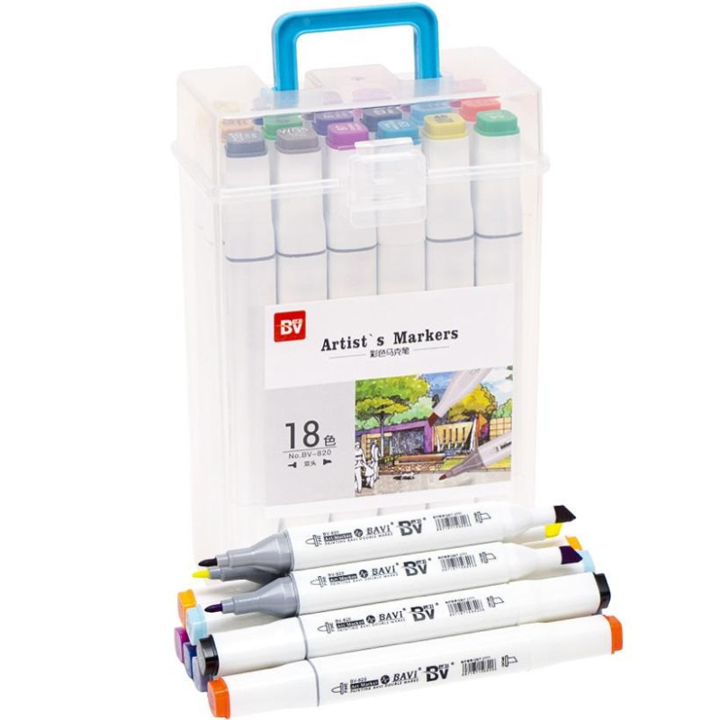 Набір двосторонніх фломастерів / скетч маркерів на спиртовій основі. У наборі 18 штук в пластиковому футлярі. З одного боку звичайний фломастер, з іншого боку скошений маркер. Кожен колір має свій цифровий код, який нанесений на ковпачок маркера. Ковпачки щільно закривають маркер, перешкоджаючи висиханню. Чорнило на спиртовій основі добре вбираються в папір, тому рекомендується використовувати щільні листи або картон. Розмір боксу 11х7х16см