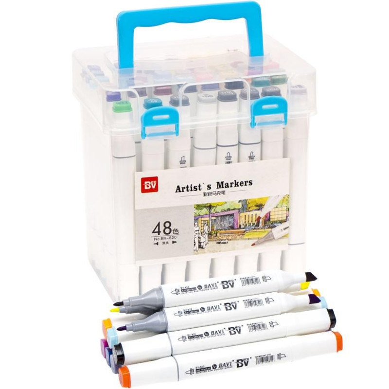 Набір двосторонніх фломастерів / скетч маркерів на спиртовій основі. У наборі 48 штук в пластиковому футлярі. З одного боку звичайний фломастер, з іншого боку скошений маркер. Кожен колір має свій цифровий код, який нанесений на ковпачок маркера. Ковпачки щільно закривають маркер, перешкоджаючи висиханню. Чорнило на спиртовій основі добре вбираються в папір, тому рекомендується використовувати щільні листи або картон. Розмір боксу 17х12х16 см