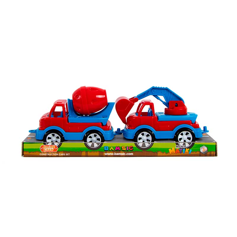 Набір дитячий “Mini Matiki ” – включає два будівельні автомобілі – екскаватор і бетонозмішувач, виконані в яскравих кольорах. Комплект призначений для дітей віком від 3 років, він ідеально підійде для маленьких будівельників, зацікавлених у пізнавальній та активній грі.