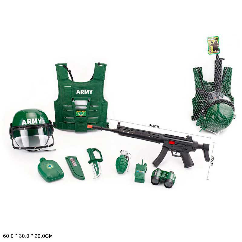 До комплектації входять захисний жилет, шолом, автомат, ніж, рація, бінокль, граната і фляга - все необхідне для створення повного образу маленького захисника світу. Цей набір стимулює уяву й активну участь у рольових іграх, даючи змогу дітям втілити свої мрії про стояння на сторожі безпеки.