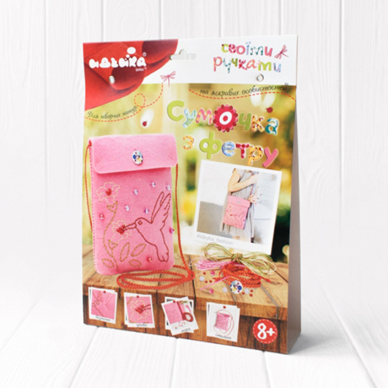 За кольоровою покроковою інструкцією дитина легко вишиє, прикрасить і пошиє сумочку. Вишивка відбувається дитячою безпечною голкою через перфоровані дірочки у фетрових деталях.