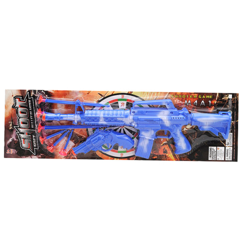 Набір синього кольору містить автомат і револьвер, дитяча зброя виготовлена із пластику, стріляє кулями на присосках.