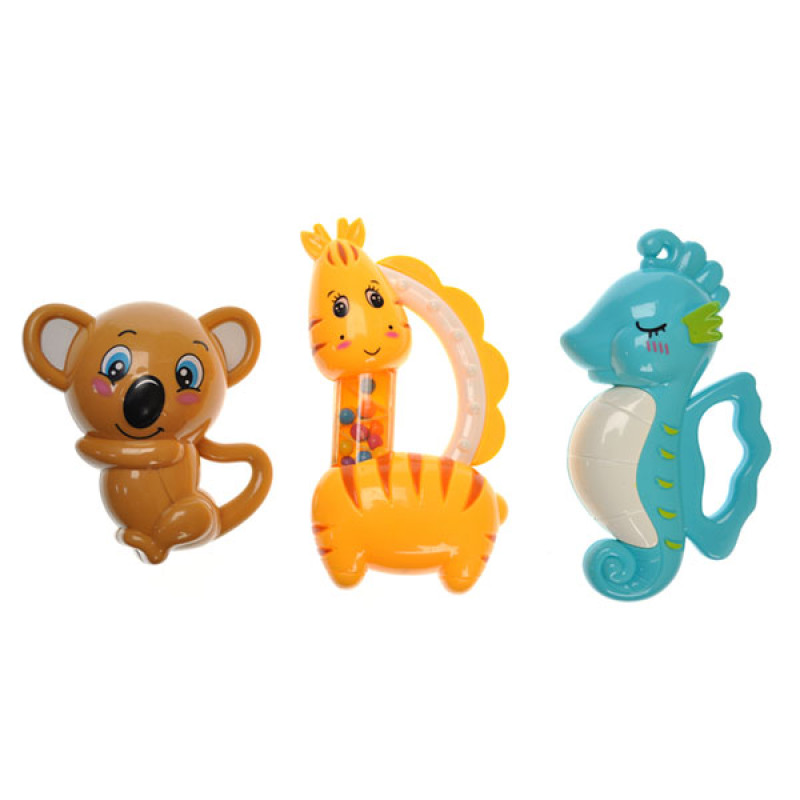 Набір брязкалець складається з яскравих пластикових брязкалець різних кольорів і форм. Брязкальця дуже яскраві, виготовлені з якісного екологічно чистого пластику. У наборі: 3 брязкальця. Найкращий подарунок для кожного малюка.