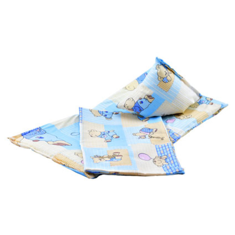 Іграшковий текстильний комплект постільної білизни для лялькового ліжечка, призначений для дітей віком від 3-х років. Матеріал-бавовна. Комплект складається з 3-х предметів: подушка бавовняна без наповнення 10 ? 10 см - 1 шт., матрацик 25 ? 45 см поролоновий обшитий бавовною - 1 шт., ковдра бавовняна 25 ? 45 см - 1 шт. Тканина різнобарвна блакитно-рожево-жовта, малюнок-тварини.