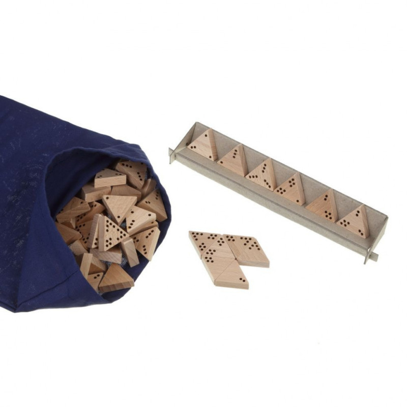 Триміно - це гра-головоломка, в яку можна зіграти, навіть вшістьох! Гра вимагає від вас розвиненого просторового мислення, логіки і швидкої реакції. У кожному кутку фішки розміщені очки в кількості від 0 до 5. Комбінації очок, зрозуміло, не повторюються. Гравці намагаються першими викласти на стіл усі свої фішки і, таким чином, завершити гру. Зробити це зовсім не просто, тому що кількість очок на фішках, які межують, має збігатися в обох кутах. У комплект гри входить 56 трикутних фішок виготовлених вручну з твердих порід дерева.