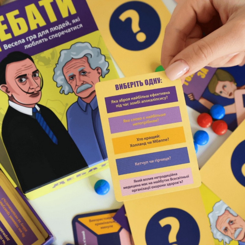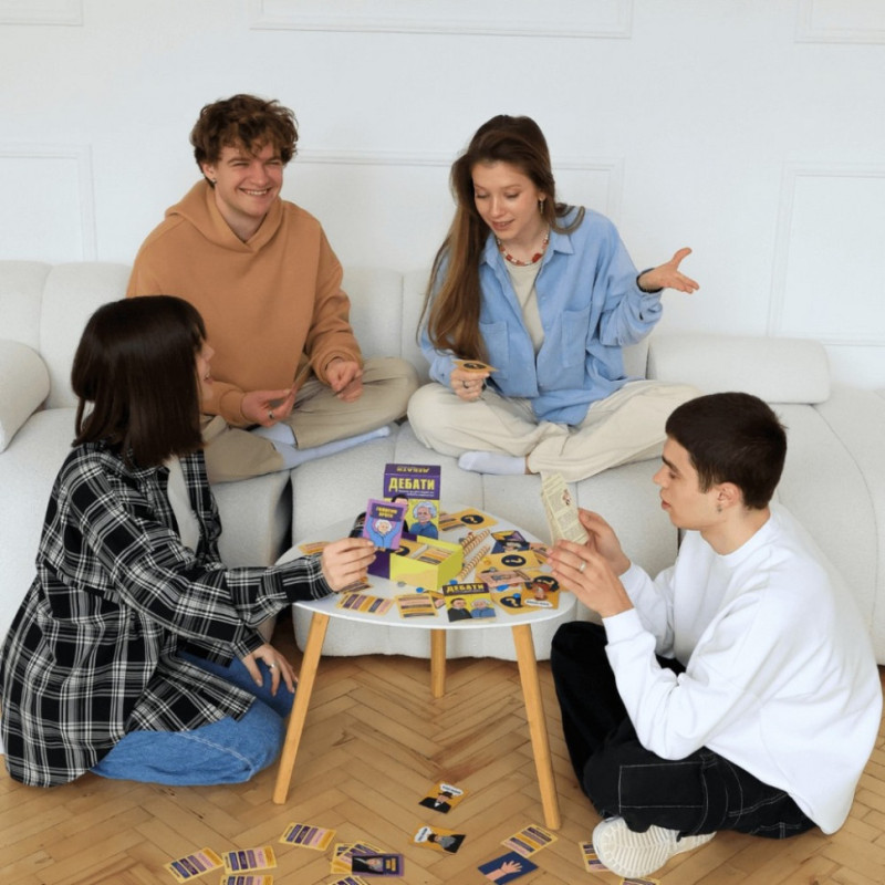 Дебати: мистецтво переконання в ігровій формі Ось бувають такі люди, які виходять з будь-якої суперечки з високо піднятою головою, навіть якщо вони не праві. Такий талант дається з народження чи вмінню володіти переконливим словом можна навчитися? Захоплююча настільна гра Дебати (укр.) створена для того, щоб розвивати вашу майстерність ораторства та критичне мислення. Простий і веселий спосіб навчитися переконувати і перемагати в будь-якій дискусії. Правила гри дуже прості. Виберіть тему і доведіть свою точку зору перед друзями або родиною. Понад 500 різних тем піднімуть ваші ораторські навички на новий рівень. Креативні стратегії дебатів Під час гри в Дебати ви можете використовувати такі креативні стратегії, як «Заперечувати все», «Вдаватися до особистих нападок» або «Використовувати вигадану науку», щоб виграти навіть найабсурднішу суперечку. Грайте, щоб навчитися перемагати в суперечках і розвивати переконливі аргументи. Це не тільки захоплива гра, а й чудовий спосіб провести час у компанії друзів. Що більше граєте, то краще ви розумієте, як наводити докази, переконуючи ваших опонентів. Додайте різноманітності у своє спілкування, граючи в Дебати, і отримуйте задоволення від навчання! Грайте, доводьте, і навчіться переконувати у найвеселішій манері! Дебати - це не просто гра, це можливість стати справжнім майстром дискусій. Для затятих сперечальників і любителів захопливих вечорів Настільна гра Дебати (укр.) підходить як затятим сперечальникам, так і тим, хто хоче набути нових корисних навичок для повсякденного життя. Якщо ви любите обговорення і словесні суперечки, вам неодмінно варто купити настільну гру Дебати (укр.), яка створена спеціально для вас! Якщо ви полюбляєте пізнавальні та вдумливі настільні ігри розмовного жанру, також рекомендуємо звернути увагу на Солов'їну Оказію (рос.), що познайомить із досконалою українською мовою. А гра Краща Версія Себе (укр.) привчить до самовдосконалення та створить із вас зовсім іншу людину. Пориньте в атмосферу захопливих дебатів, навчіться вигравати суперечки та розвивати навички переконання в найігровій і невимушеній формі!