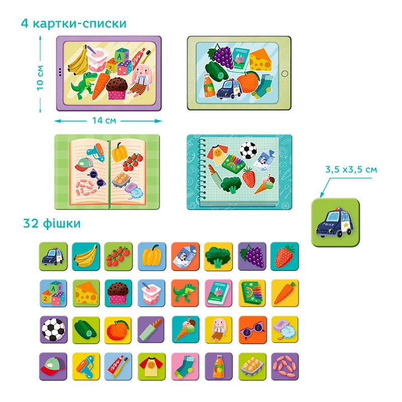 | Комплект постачання | 4 планшетки, 4 картки, 32 фішки, інструкція |