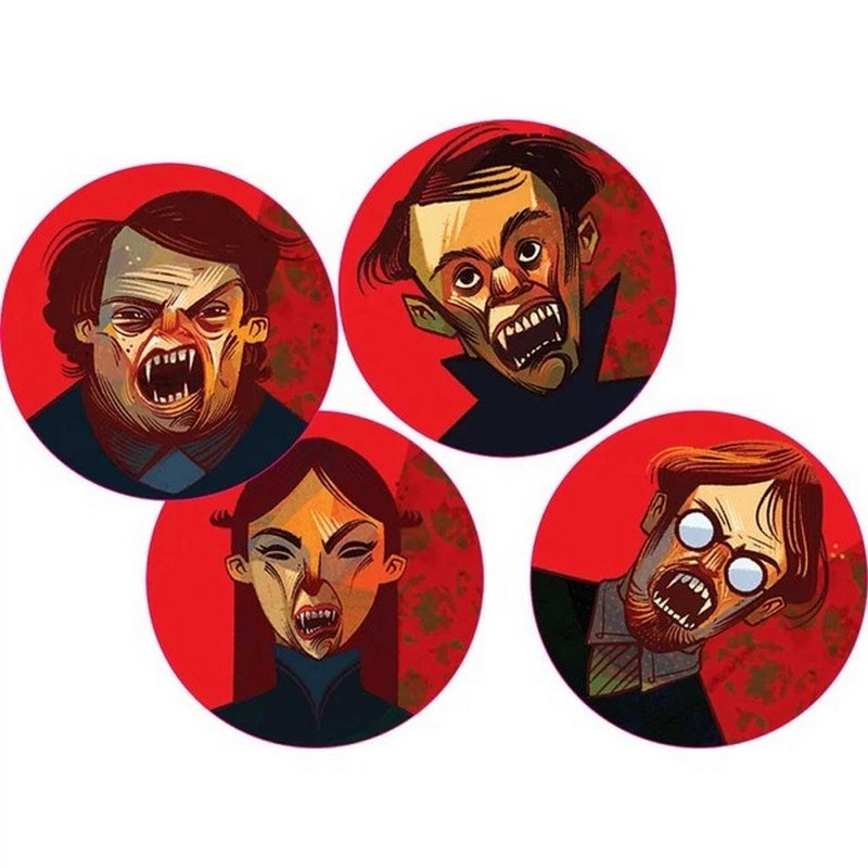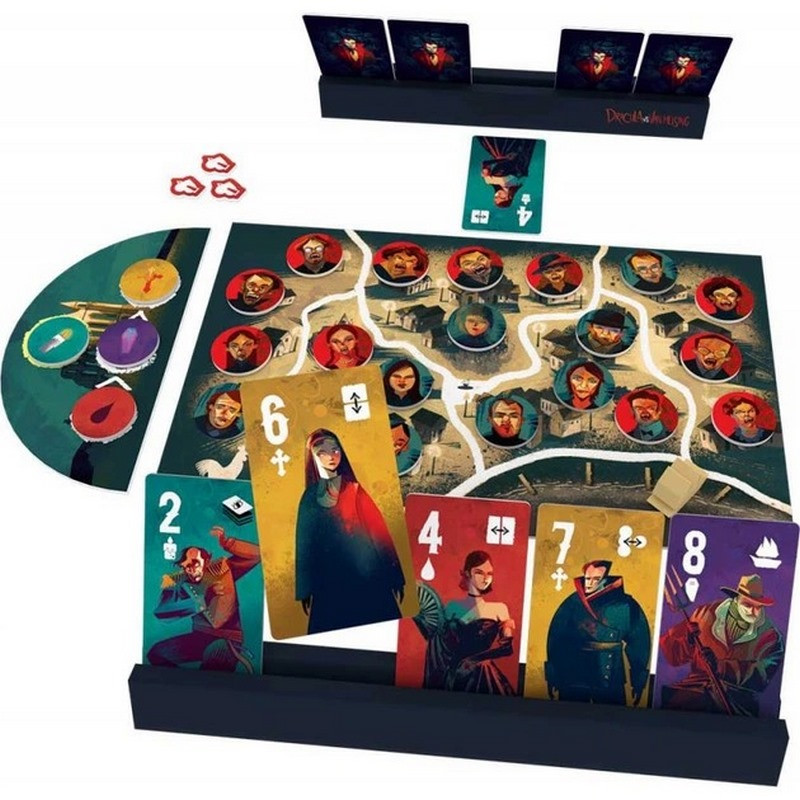 Увага, зараз стане справді жахливо! Уявіть собі: до берега прибиває якийсь корабель, ви сходите на борт, а там - скривавлені дошки, ані душі людської та самі лише коробки, сповнені землі! Нічне жахіття наяву! А після того, як ви прийдете до тями, знаєте, що станеться. - Ми впевнені, що оце: ви поспіхом пострибаєте по Ван Гельсінґа, бо лише він може якось зарадити прибуттю Дракулі у Вітбі! Сьогодні перед вашими очима розгорнеться історичний двобій: хто ж переможе - найвідоміший серед вампірів чи найвідоміший серед мисливців на вампірів. І ким захочете стати ві? Асиметрична дуельна настілка пропонує вам взяти на собі роль когось із цих файних хлопців та досягти своєї мети: Ван Гельсінґ переможе, убив Дракулу, - у того мають закінчитися всі його окуляри здоров'я; победа Дракулі загрожуватиме світові хаосом, але, може, ви цього й прагнете - зробіть так, щоб усі 4 мешканці одного району стали вампірами, або ж просто доживіть до кінця партії! Протягом п'яти раундів ми будемо ходити по черзі, добираючи та розігруючи картки. Тобто, так: беремо з колоди якусь картку, а далі відразу відправляємо її в стоп скидання, щоб застосувати її властивість, або замінюємо нею одну зі своїх карток у ряди, і вже ту картку розігруємо, намагаючись будь-що утруднити життя суперникові. Після того, як у скиді опиниться більш ніж 6 карток, хто завгодно з гравців може оголосити завершення раунду (раунд також завершиться, якщо колоду добору буде спустошено). Суперник робить останній хід, і настає час перевірки: порівнюємо картки за районами - ваші й суперники: козирні картки перемагають такі, що не є козирними; якщо і у вас, і у соперника в якомусь із районів козирні картки або якщо обидві картки не є козирними, потрібно звірити їх значення - переможе найбільше; якщо ж зустрілися картки з однаковим значенням, потрібно виявити старший колір, звернувшись до планшета рейтингу кольорів. Коли район виграє Дракула, він обертає одного з мешканців цього району на вампіра - переверніть жетон цього бідака вампірським боком угору! Ван Гельсінґ у свою чергу, вигравши, завдасть Дракулі шкоди - приберіть один жетон здоров'я незниженого кровопивця. Перевіривши райони, перемістіть маркер корабля на наступну ділянку і розпочинайте новий раунд, аж поки хтось з вас не здобути победу, чи поки не зіграєте 5 раундів поспіль.ДЛЯ КОГО ГРА Невеличку за об'ємом, але не за змістом кулаками: просто виберіть бік і зіграйте в настілку, а переможець най отримає цукерочку, щоб утамувати голод, хоч тільки не криваву!