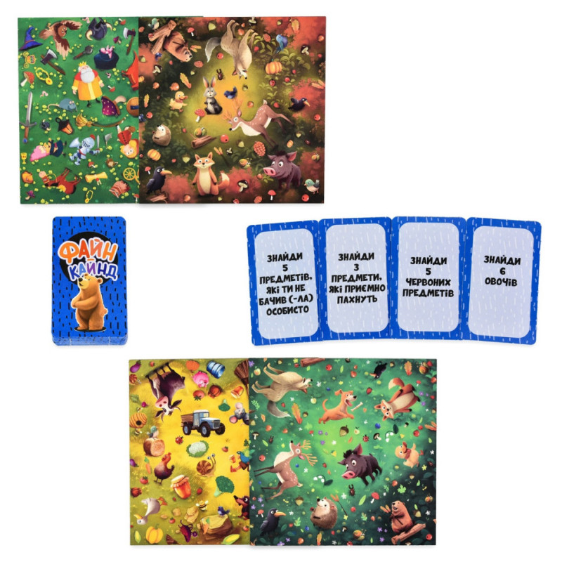 «Файн-Кайнд» — настільна гра для дітей, що розвиває увагу й логіку. Гравці шукають потрібні предмети, вчаться бачити спільне в різному та пізнають світ. У наборі — 36 карток, 2 поля й інструкція.