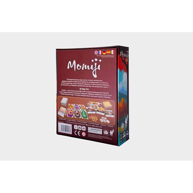 «Momiji» — атмосферна настільна гра, дія якої розгортається в Імператорському саду пізньої осені. Дерева вкриті багряними, золотими та бурштиновими відтінками, свіжий вітер кружляє кленове листя, а природа готується до зимового відпочинку. Гравці збирають набори осіннього листя та використовують особливі властивості пейзажів, щоб виконати завдання й отримати якомога більше балів.