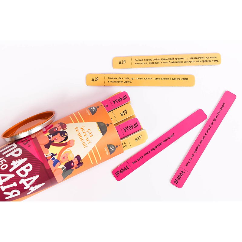 «Правда чи Дія: для веселої компанії» — це класний спосіб урізноманітнити будь-яку вечірку! Вдома, в барі чи на природі — з цією грою сумувати не доведеться.