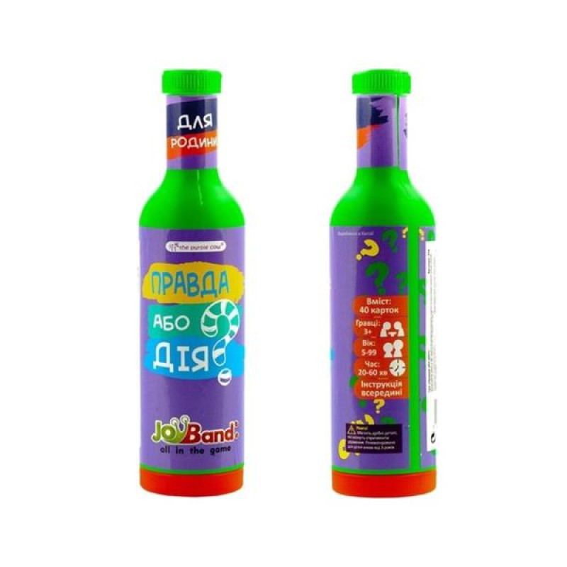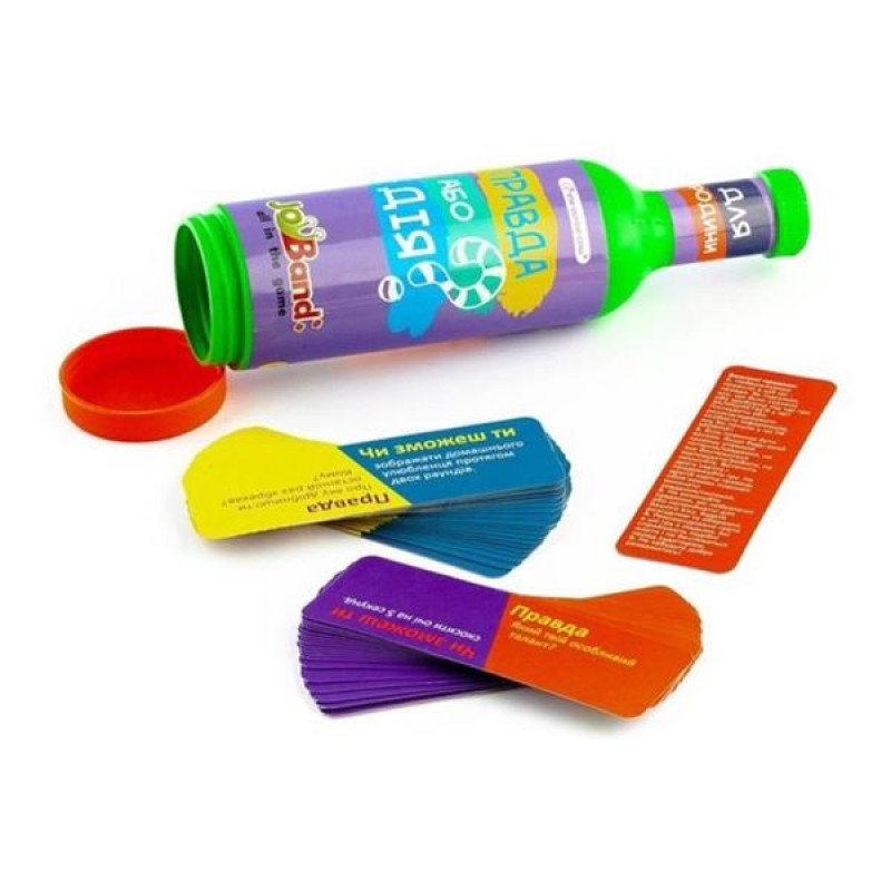 Розважальна гра Правда або дія від бренду JoyBand допоможе провести веселі вечори в родинному колі або друзів. За допомогою цієї класичної гри можна перетворити будь-який вечір у колі друзів на незабутні веселощі. Розвага допомагає розвивати мову, уяву, креативність.Правила гри:Гравець обертає пляшку: на кого вона вкаже, той має обрати «Правда чи дію». Кожен учасник може вибрати:'Правда' - відповісти на смішне питання.'Дія' - виконати кумедне завдання.Якщо гравець відповідає нечесно, він повинен виконати обидва завдання. Після того, як учасник відповів або виконав дію, він крутить пляшку для нового раунду.Комплектація: пляшечка; 40 карток; Інструкція. Кількість учасників: від 3-х.Час гри: 20-60 хв.Мова гри: українськаРекомендований вік: від 5 років.