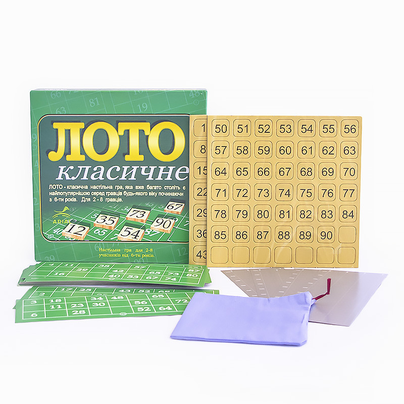 Настільна гра Arial Лото класичне 910046, яка не потребує представлення, не залишить Вашої дитини байдужою. Захоплююча популярність у всьому світі, захоплююча настілка, обожнювана і серед дорослих, і серед діточок, стане ідеальним приводом, щоб зібратися в колі близьких або друзів в один з вечорів. У подібних іграх не обійтися без винахідливості та кмітливості, які стануть у нагоді Вашому чаду в реальному житті, допоможуть йому навчитися самостійно та швидко приймати рішення. Лото розвиває логічне та аналітичне мислення, зорового сприйняття, активізує слухову та тактильну пам'ять. Для створення набору український виробник Arial застосував екологічно чисту сировину, без небезпечних дитячого здоров'я, токсичних барвників. Кожен учасник вносить у банк оплату, після чого отримує картку з цифрами, а ведучий гри витягує з мішечка плашки, називаючи число. Якщо гравець має таке число на картці, то він накриває його фішкою. Виграє та забирає весь банк той, хто першим закриє усі осередки на своїй ігровій карті.