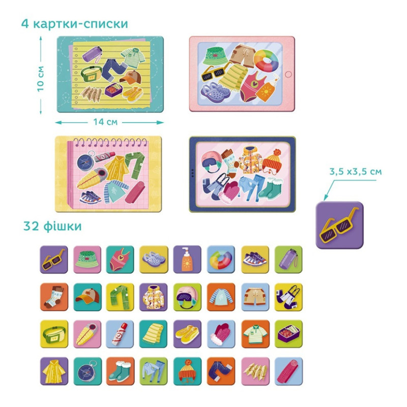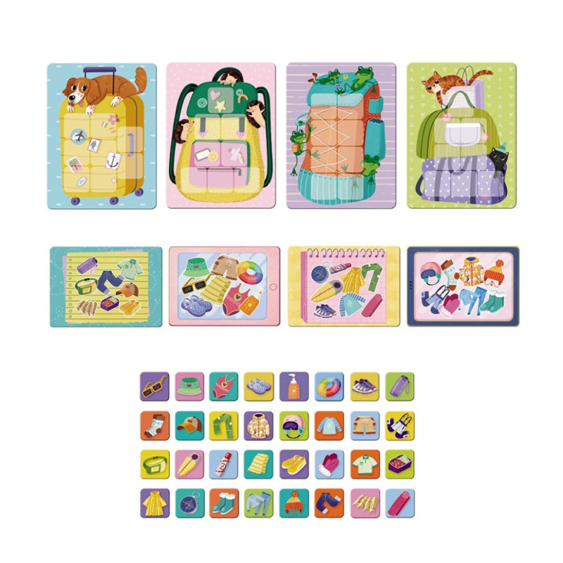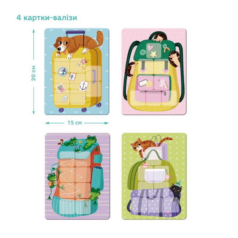 У цій грі для маленьких дослідників кожен гравець обирає свою "валізу" та отримує список речей, які потрібно взяти у подорож. Всі фішки перевертаються зображенням вниз. Гравці по черзі відкривають фішки й вимовляють назву предмета. Якщо предмет є у їхньому списку — фішка відкладається у валізу. Якщо ні — повертається на місце.