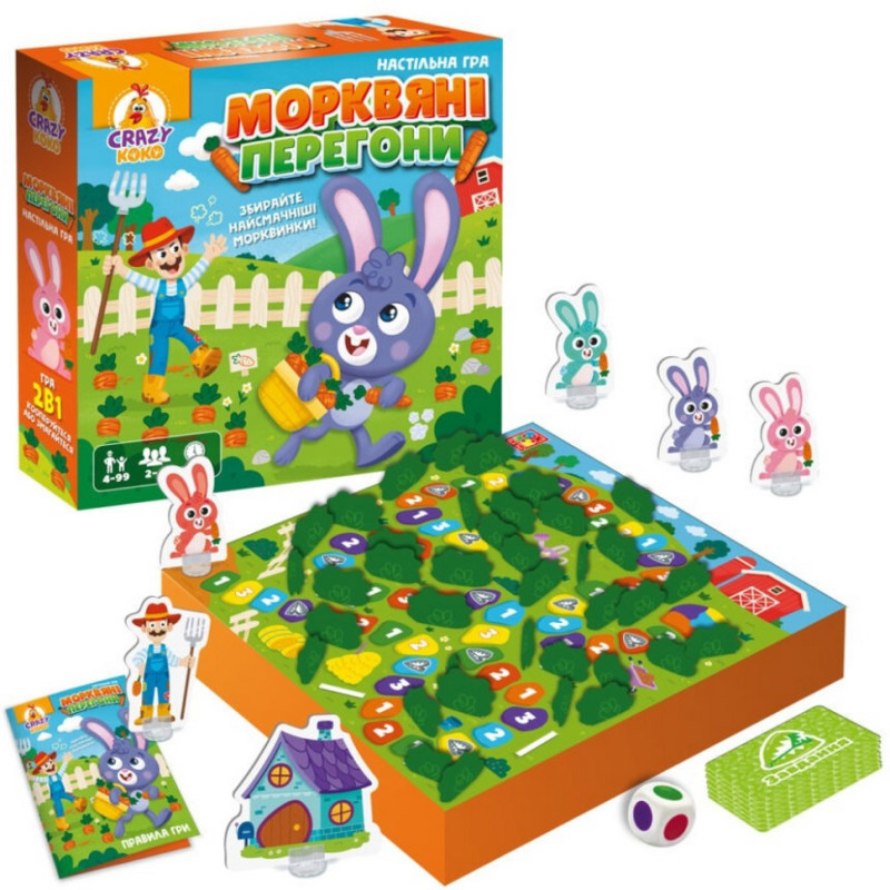 “Морквяні перегони” – цікава і жвава настільна гра 2 в 1 з кубиком. Зайці наввипередки біжать з лісу за морквою. Хто збере найдовший рядок моркви на полі? Докладай зусилля і вигравай.