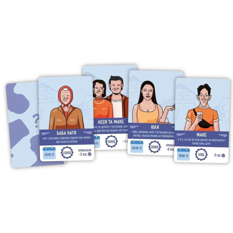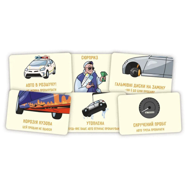 Перекуп - економічна карткова гра для 2-6 гравців, де учасники скуповують, тюнінгують і продають автомобілі з пробігом. Підходить для новачків і досвідчених гравців.