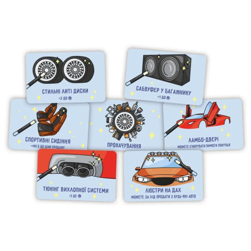 Карти автомобілів, покупців, прокачування, сюрпризів, кубик, жетони грошей, шпаргалки для новачків.