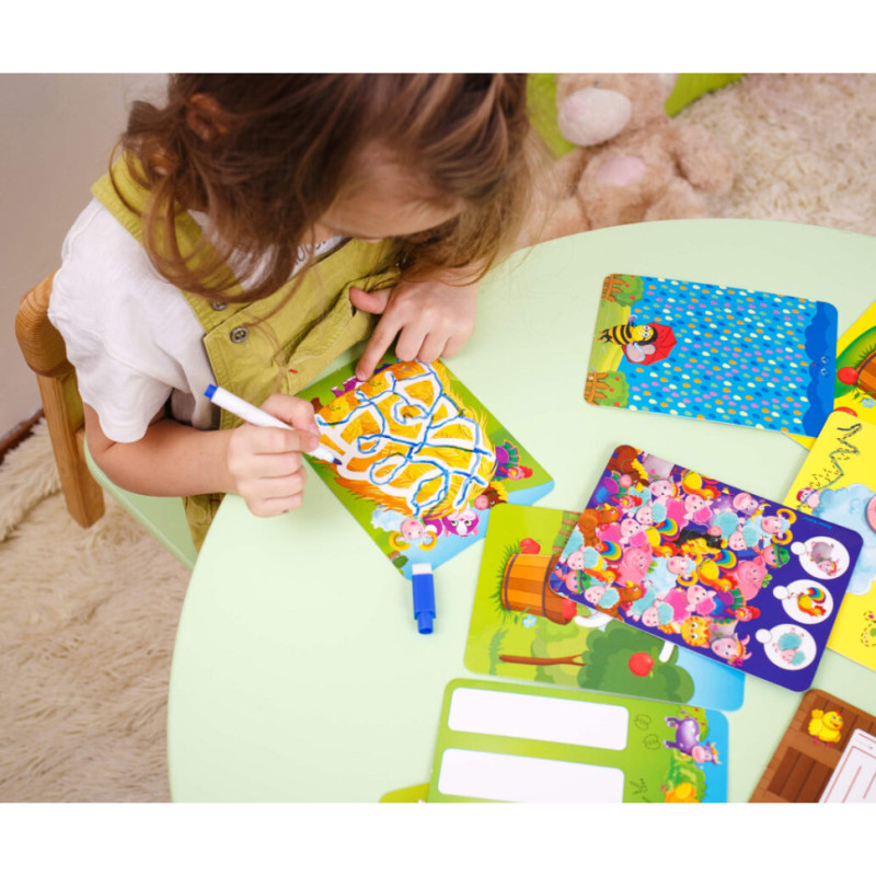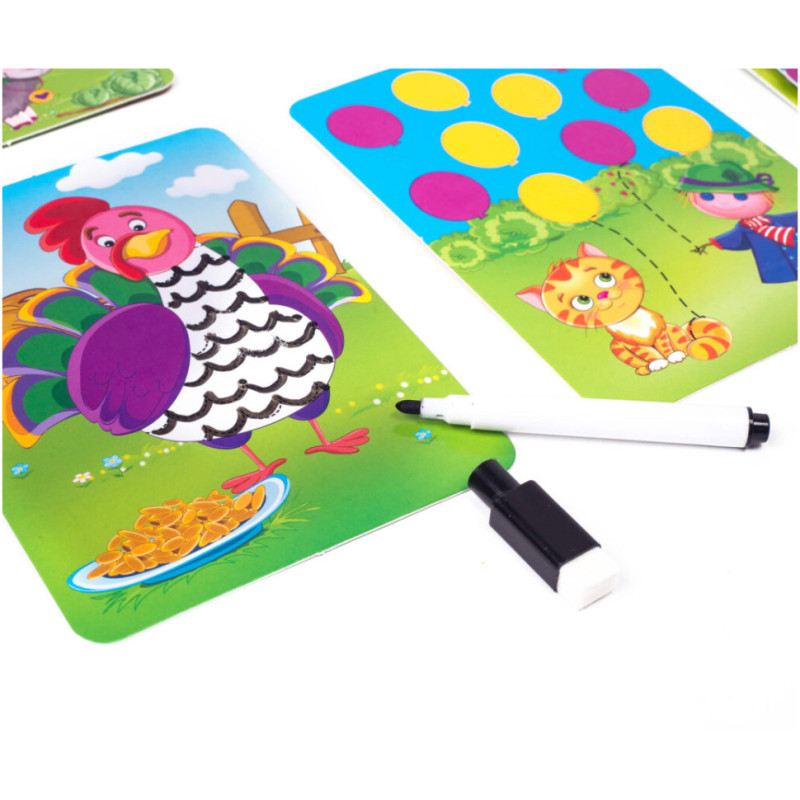 А за допомогою спеціального маркера «Пиши-витирай», усі завдання можна виконувати безліч разів. Просто витирайте написи губкою та пишіть знов.
