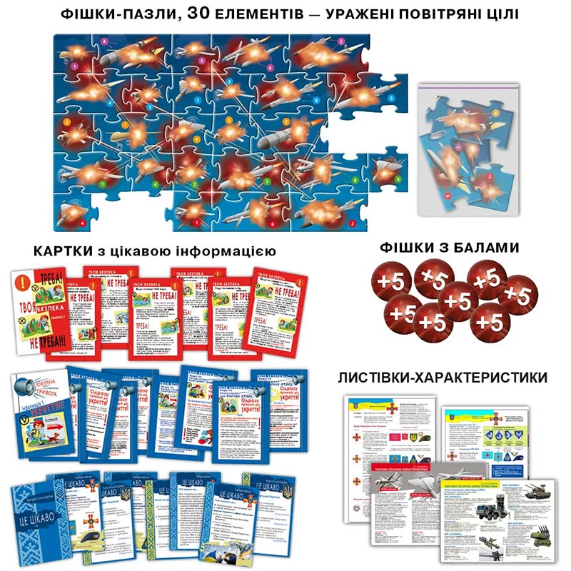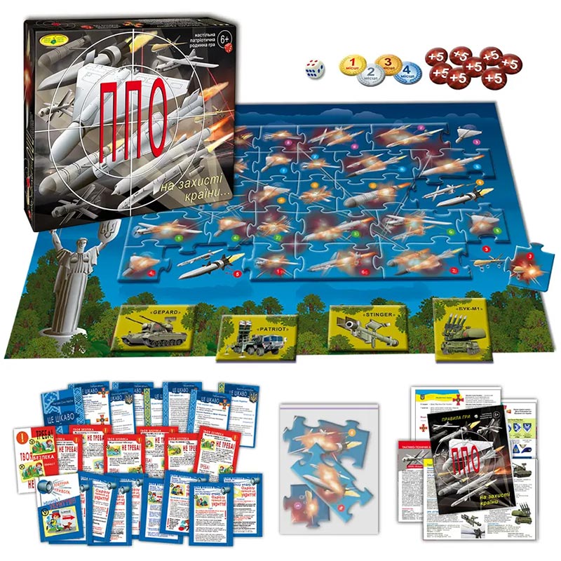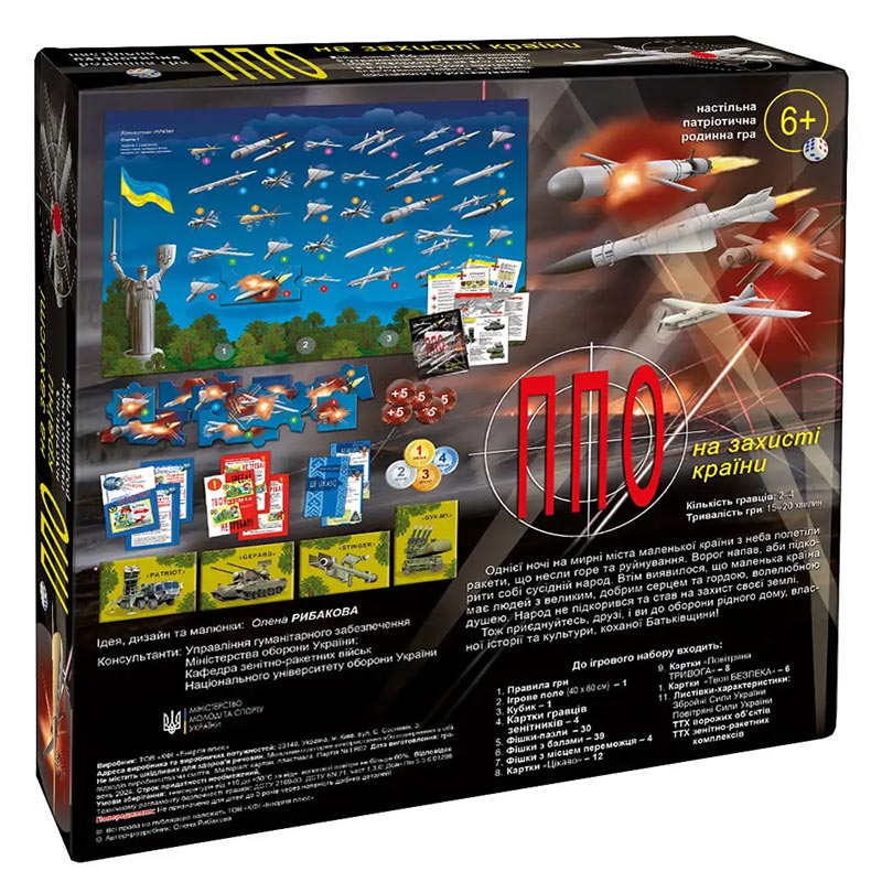 Настільна гра «ППО на захисті країни» — авторська патріотична сімейна гра Олени Рибакової ідеально підійде для сімейного дозвілля та патріотичного виховання дітей віком від 6 років. Однієї ночі на міста мирної країни з неба полетіли ракети, що несли горе та руйнування. Ворог напав, аби підкорити собі сусідній народ. Втім, виявилося, що незламна країна має людей з великим, добрим серцем та гордою, волелюбною душею. Народ не підкорився та став на захист своєї землі. Тож приєднуйтесь, друзі, до оборони рідного дому, власної історії та культури, коханої Батьківщини! Ваше завдання — знищити ворожі БПЛА, та ракети. В цьому вам допоможуть різні системи протиповітряної оборони (ППО). На початку гри кожен гравець обирає собі картку з зенітним ракетним комплек- сом, яким він буде вражати цілі. Поруч з ігровим полем кладуть фішки-пазли та в колоди складають картки «Це цікаво», «Повітряна тривога» та «Твоя безпека». На ігровому полі зображено небо країни та ворожі ракети й БПЛА, які потрібно знищити. Всі об’єкти пронумеровані та позначені різними кольорами. Спочатку зни- щуються цілі, позначені червоними кружечками, потім зеленими, жовтими, блакит- ними й наприкінці — бузковими. Кожен знищений об’єкт оцінюється у 5 балів. Якщо гравцю пощастить одним пострілом збити дві цілі, тоді гравець отримує дві фішки по 5 балів. Якщо при наступному пострілі випадає номер вже знищеного об’єкта, постріл вважається «промахом», а гравець читає вголос одну з карток «Це цікаво», «Повіт- ряна тривога», «Твоя безпека», обравши її довільно. Гра триває доти, поки не будуть знешкоджені всі ворожі об’єкти. Після цього гравці підраховують бали на своїх фішках. Перемагає той, у кого найбільше балів! Коли битва завершена, на ігровому полі утвориться великий пазл. Переверніть його на зворотний бік. На вас чекає сюрприз! Ви побачите Мрію всього українсь- кого народу в мирному небі. Тож, друзі, до бою, до Перемоги! Кількість гравців — 2–4. Тривалість гри — 15–20 хвилин. Ідея, дизайн та малюнки: Олена РИБАКОВА Консультанти: Управління гуманітарного забезпечення Міністерства оборони України; Кафедра зенітно-ракетних військ Національного університету оборони України КОМПЛЕКТАЦІЯ: 1. Правила гри 2. Ігрове поле (40 х 60 см) – 1 3. Кубик – 1 4. Картки гравців-зенітників – 4 5. Фішки-пазли – 30 6. Фішки з балами – 38 7. Фішки з місцем переможця – 4 8. Картки «Це Цікаво» – 12 9. Картки «Повітряна ТРИВОГА» – 8 10. Картки «Твоя БЕЗПЕКА» – 6 11. Листівки-характеристики