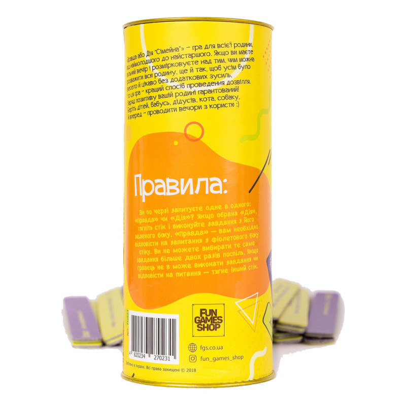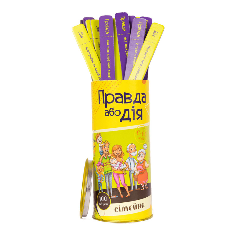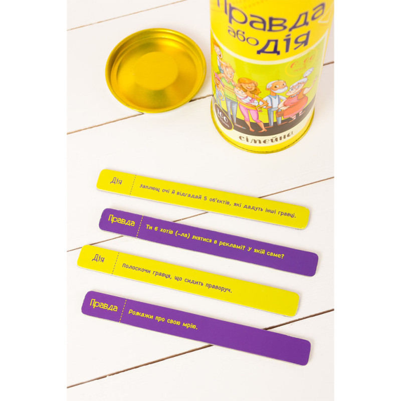Опис: «Правда або Дія: Сімейна» — гра для всієї родини, від наймолодшого до найстаршого. Якщо ви маєте вільний вечір і розмірковуєте над тим, як можна розважити всю родину, ще й так, щоб усім було весело й цікаво без додаткових зусиль, то ця гра — найкращий спосіб проведення дозвілля. Заряд позитиву вашій родині гарантований! Беріть дітей, бабусь, дідусів, кота, собаку, і вперед — проводити вечори з користю!