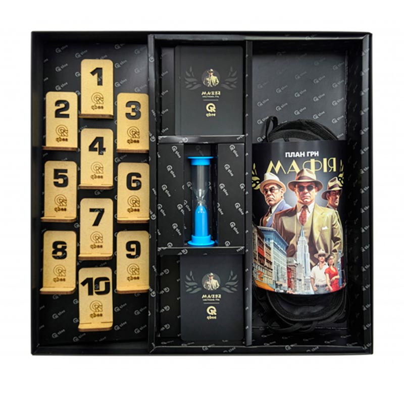 Настільна гра qbee "Мафія Делюкс" з пісочним годинником повязками для очей номерками QB701-002