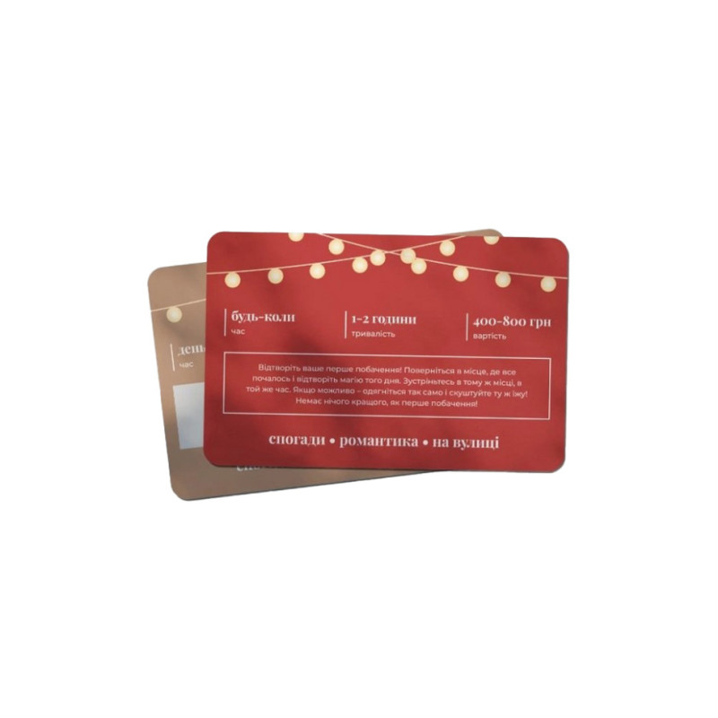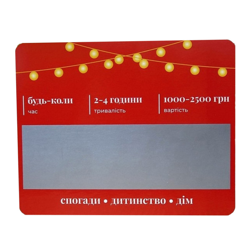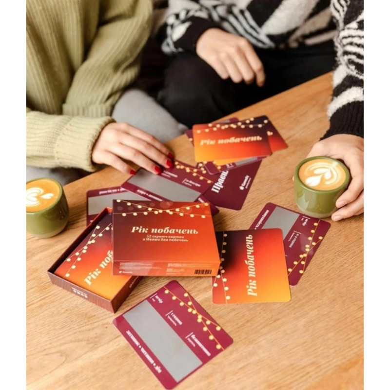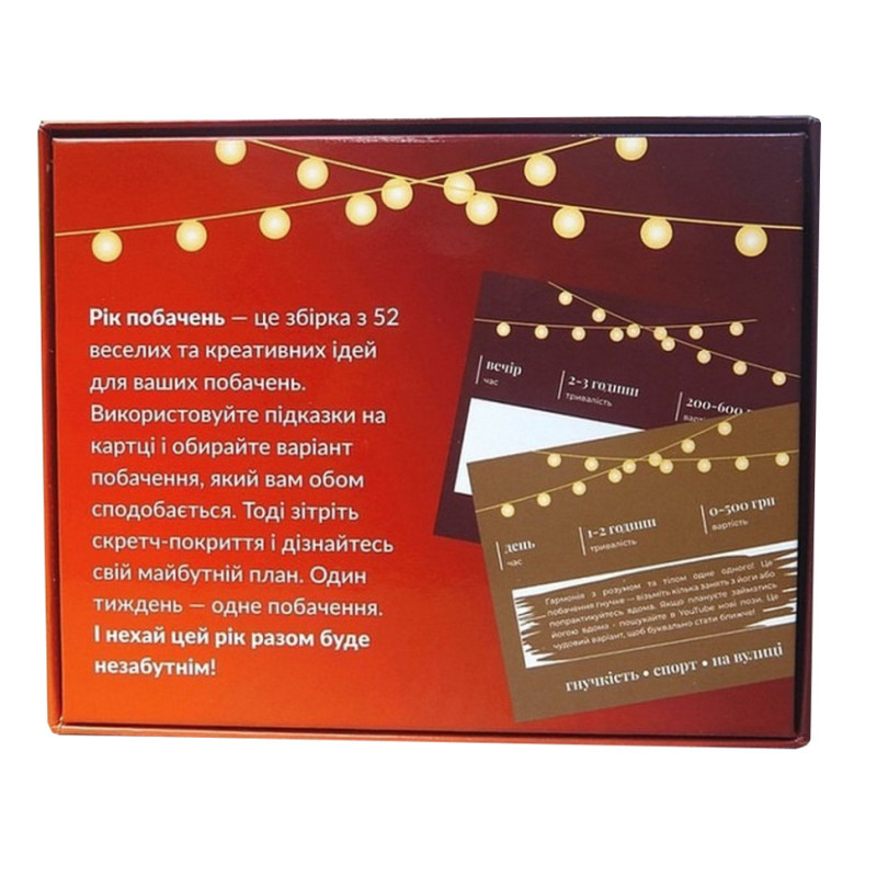 Створіть свій незабутній рік разом! З грою для пари "Рік побачень". Ідеальний спосіб зміцнити стосунки, додати в них іскорку і отримати масу позитивних спогадів на весь рік! Отримуйте незабутні спогади щотижня. Час, тривалість, бюджет та емоції - кожне побачення різне і тільки ви обираєте, яке вам сьогодні до душі. Оберіть побачення за загадковим описом і дізнайтеся деталі після стирання скретч-покриття. Усі картки мають деталі про побачення: Час доби Тривалість Вартість 3 слова, які описують побачення Як отримати максимальне задоволення від гри? Заплануйте час для побачень. Один тиждень - одне побачення. Заплануйте собі час щотижня для вас двох Виберіть побачення, на яке ви маєте настрій згідно з підказками Зітріть скретч-покриття копійкою та прочитайте ваше наступне побачення Проведіть незабутній час разом. Вирушайте на побачення, відключіть телефони та проведіть цей час тільки удвох! "Рік побачень" - унікальний і продуманий подарунок на всі випадки життя: ювілеї, дні народження, весілля, заручини, День святого Валентина, Різдво та багато іншого. Вона містить 52 скретч-картки (стираються монеткою). Якщо використовувати по 1 картці на тиждень, гри вам вистачить на цілий рік....