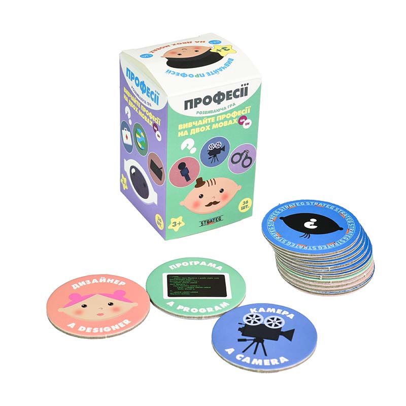 Гра “Професії” - навчальна настільна гра, створена спеціально для маленьких карапузиків. Вона складається з 36 тайлів, кожен з яких містить професію та два пов'язаних предмети з нею.