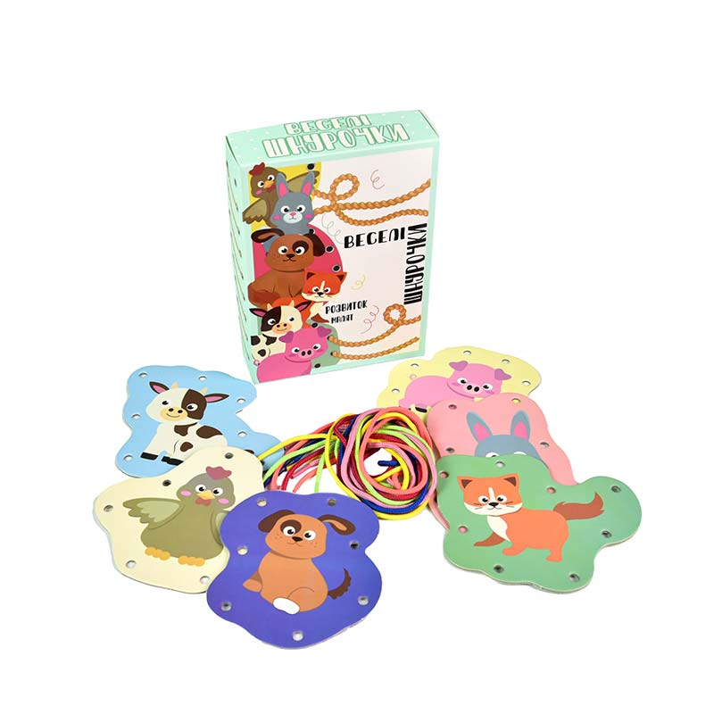 ? Комплектація: коробка, картки-тварини, шнурочки, інструкція.