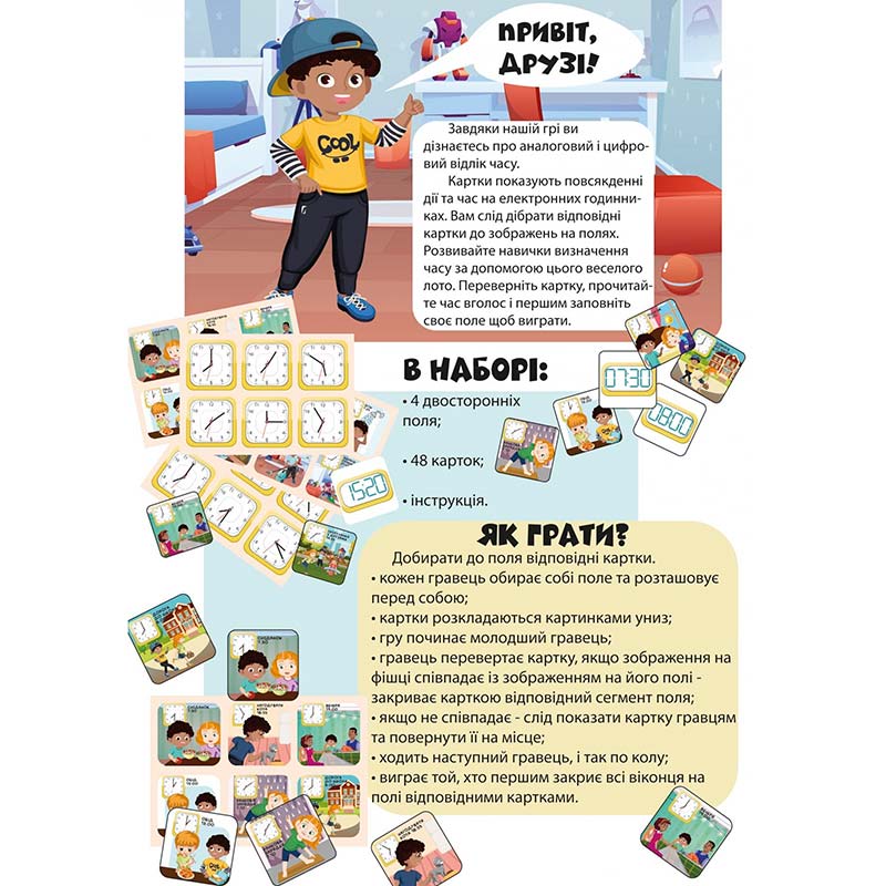 Весела та корисна гра, створена, щоб у захопливій формі допомогти дітям оволодіти навичками орієнтування в часі. Барвисті ілюстрації, прості правила та елементи змагання роблять навчання природним і мотивуючим.