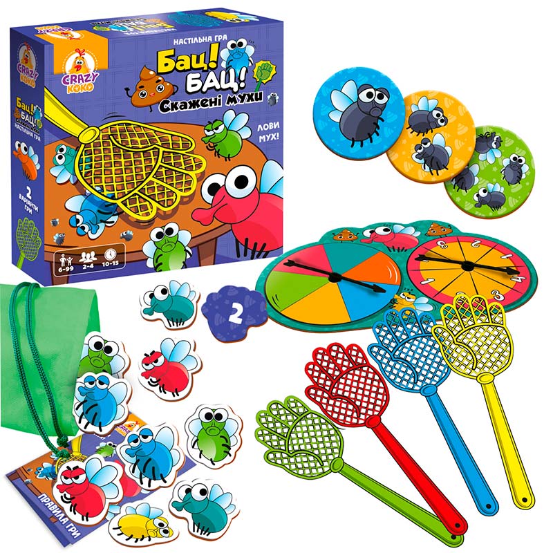 Комплектація: 4 мухобійки, 50 мух, 24 фішки, колесо фортуни, торбинка для мух, правила гри.