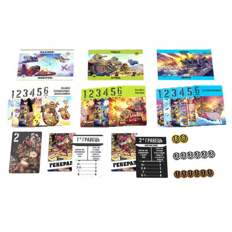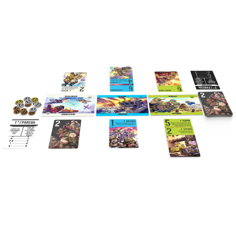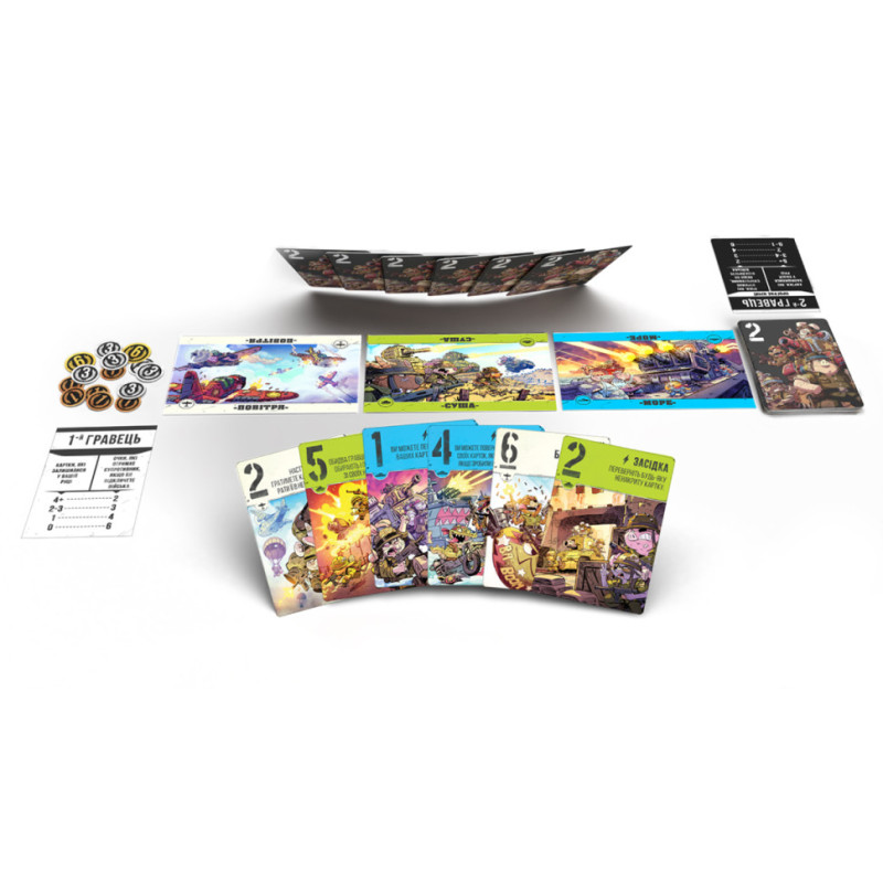 На початку партії на стіл викладаються 3 карти фронтів у довільному порядку: моря, повітря та землі. Гравці отримують на руки по 6 карток з 18-карткової колоди.