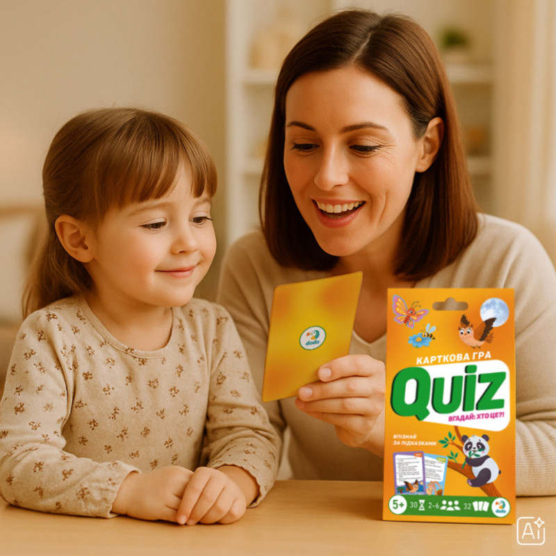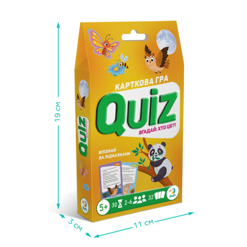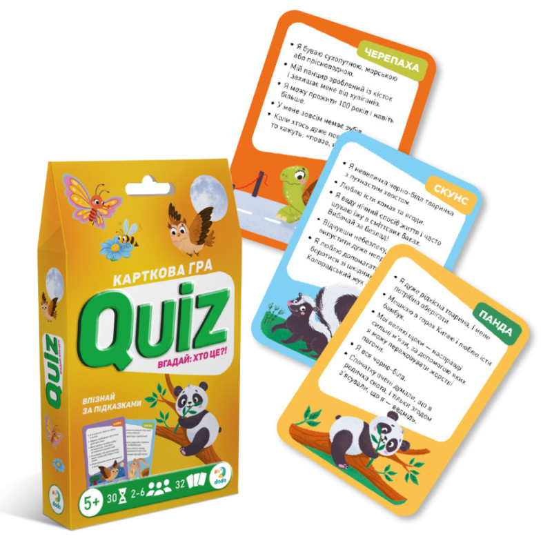Quiz — це захоплива карткова гра, яка перетворить розгадування загадок на веселу пригоду! Спробуй за підказками на картці здогадатися про кого чи що йде мова. Кожна правильна відповідь наближає тебе до перемоги