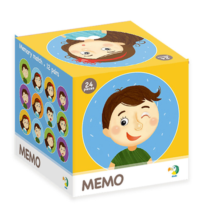 Настільна гра Мемо Емоції - варто лише розкласти фішки зображенням донизу в довільному порядку, після чого гравець піднімає дві будь-які фішки, а якщо зображення на них однакове, відкладає їх.
