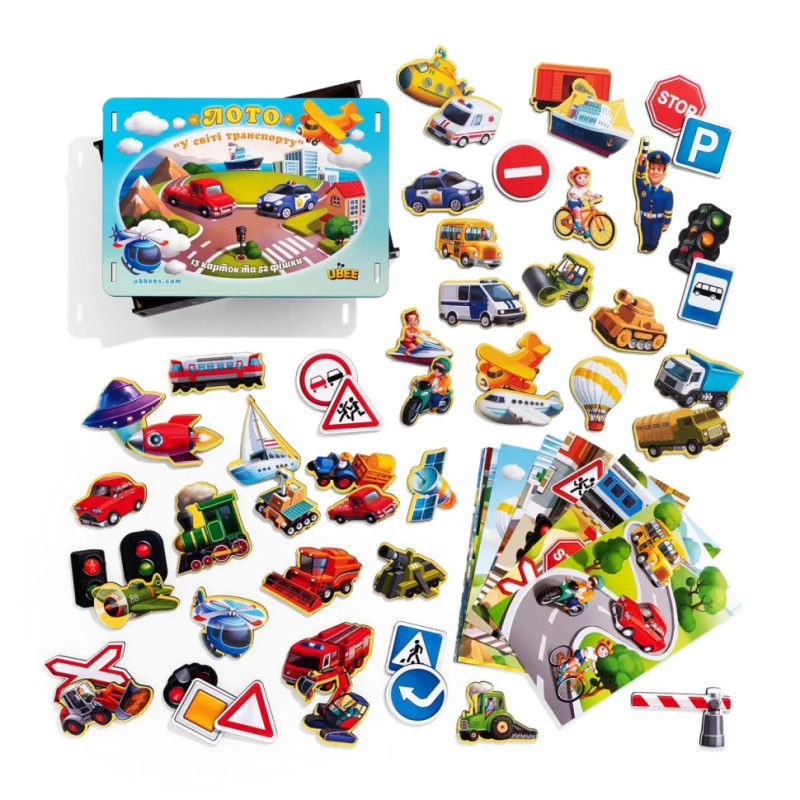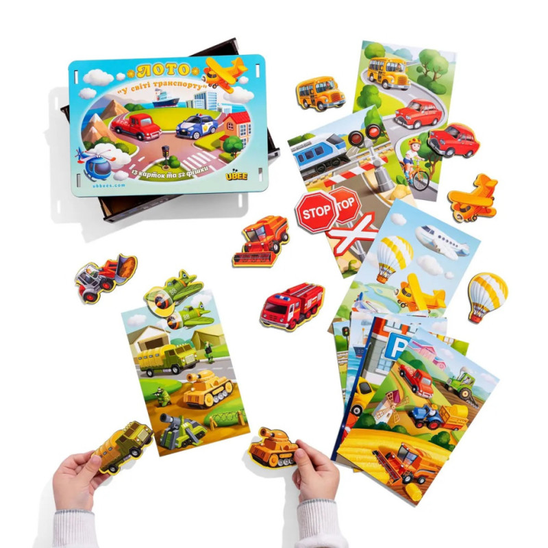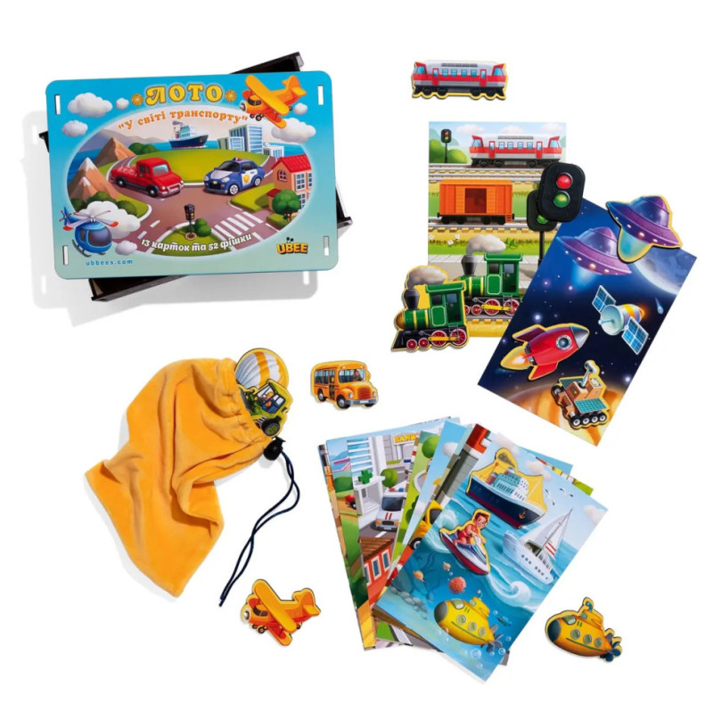Перед Вами гра для дітей, лото "Транспорт". У яскравій коробочці Ви знайдете: 52 фігурні фішки та 13 ігрових карток. Картки розділені за тематикою: наземний, повітряний, космічний, військовий, сільськогосподарський, будівельний, залізничний, водний та спецтранспорт, а також дорожні знаки. Як грати: необхідно роздати всім учасникам по ігровому полю, на якому зображені різні види транспорту. Усі фішки потрібно покласти у мішечок (йде у наборі) та перемішати. Кожен гравець повинен по черзі діставати фішки. Якщо у когось з гравців виявиться малюнок ідентичний малюнку на фішці - він забирає її собі і накриває фішкою свій транспорт на картці. Виграє той, хто першим накриє своє ігрове поле.