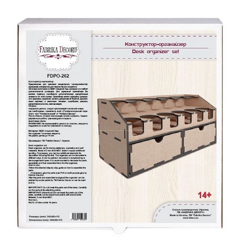 Заготовка виконана з MDF (HDF) товщиною 3 мм, матеріал не потребує додаткової шліфовки. Для того, щоб прикрасити органайзер, Ви можете окремо придбати додаткові декоративні елементи за цим посиланням. Органайзер можна оформити (прикрасити фарбами, морилкою, обклеїти декоративним папером, декупажними картами) в різних техніках: скрапбукінг, декупаж, декоративний розпис, мікс-медіа.
