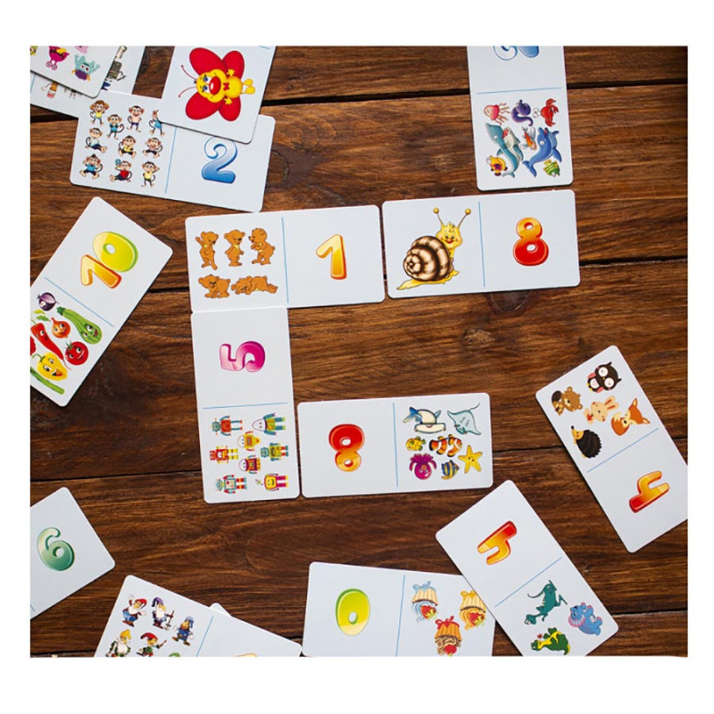 Кожну картку, як і в звичайному доміно, розподілено навпіл. Ліворуч намальовано декілька предметів, а праворуч ̶ знаки: «˃», «˂», «=». У свій хід гравець повинен або приставити до картки з кількістю предметів картку з відповідним знаком, або до знаку картку з кількістю предметів.