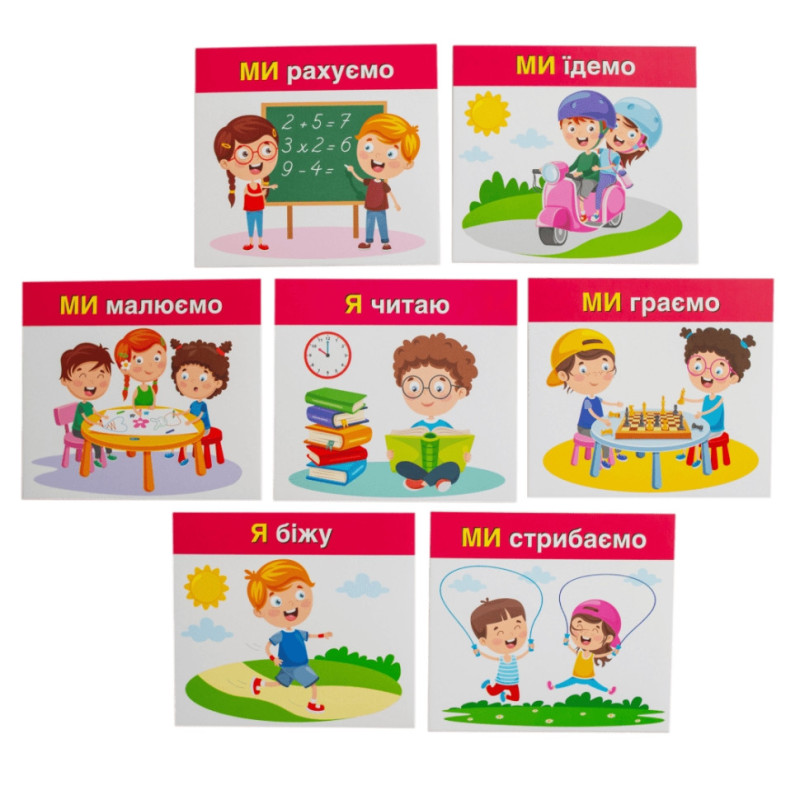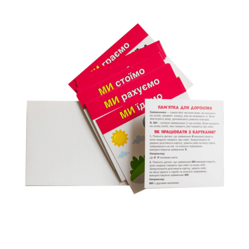 Цей набір допоможе малюкам у захопливій ігровій формі познайомитися із займенниками «Я» і «МИ». Робота з картками розширює словниковий запас, розвиває пам’ять, уважність і зорове сприйняття.