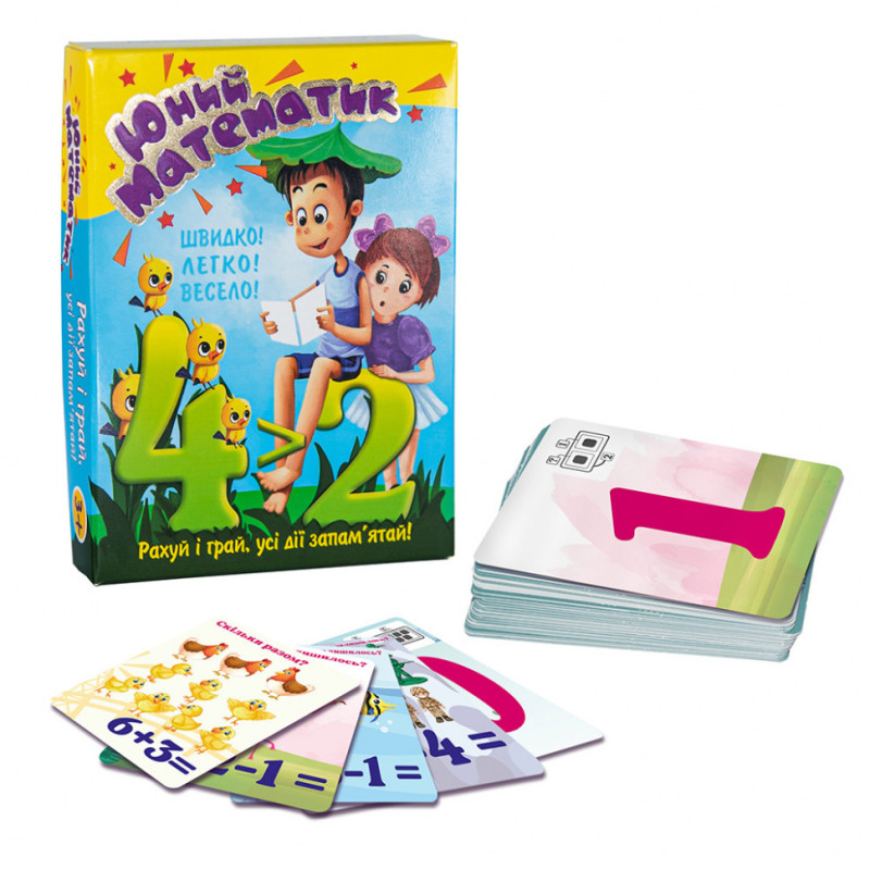 «Юний математик» - гра для дітей від 3 років, яка допоможе їм розібратися з рахунком в межах 10. У даній грі є 48 двосторонніх карток, за допомогою яких дитина буде вдосконалити навички додавання, віднімання і порівняння. Також завдяки кольоровим картками дитина зможе самостійно перевірити правильність рішення зіставивши необхідні зображення, а на чорно-білих може спиратися на схемки. Кілька карток є з завданнями, які дитині слід вирішити самостійно, без підказок. Їх краще використовувати після того, як матеріал буде повністю зрозумілий. Математичні здібності бувають не тільки вродженими, тому розвивайте свого юного генія з ранніх років.