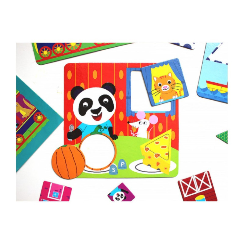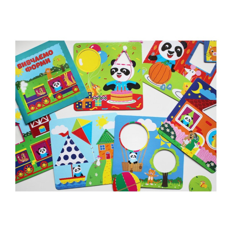 У наборі 6 карток 20х20 см. Кожна картка має свій сюжет і включає пазли у вигляді трикутника, кола та квадрата, які дитина може легко зібрати.