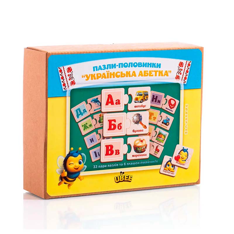 Цей унікальний настільний набір не лише вчить малюків алфавіту, але й розвиває їх уяву та логічне мислення! Кожен елемент цього набору - це пазл-половинка з деревини, яка містить букву алфавіту. Ліворуч розміщена буква, а праворуч - слово, яке починається з цієї самої літери. Ваш малюк з нетерпінням збиратиме кожен пазл, поєднуючи букву з відповідним словом. Від "А" як "Автобус" до "Я" як "Яблуко", цей набір допоможе дітям вивчити алфавіт і відповідні слова, зберігаючи при цьому веселість та цікавість. Зроблений з якісної та безпечної деревини, кожен пазл має гладку поверхню і відмінно підходить для маленьких ручок.